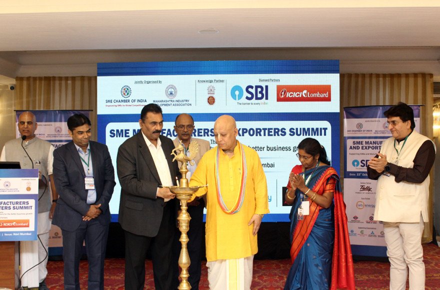 (His Grace). Dr. Surdas Prabhu – President & Trustee, ISKCON Temple, Kharghar, Navi Mumbai inaugurating the SME MANUFACTURERS AND EXPORTERS SUMMIT organised by SME Chamber of India and Supported by ISKCON – Kharghar, Navi Mumbai. Others (L to R) Mr. Vaishnavanghri Sevak Das – Director, Bhaktivedanta College of Vedic Education – ISKCON, Navi Mumbai, Mr. Praladh Biradar – Vice President, ICICI Lombard General Insurance Company Ltd, Mr. Chandrakant Salunkhe – Founder & President, SME Chamber of India and Maharashtra Industry Development Association, Mr. Varadhan T. R. – Vice President, SME Chamber of India and Director, Mascot Systems Pvt. Ltd., Ms. Puspanjali Nayak – AGM – SME, State Bank of India and Mr. Mayank Thakker – Managing Director, LYM Technologies Pvt. Ltd.