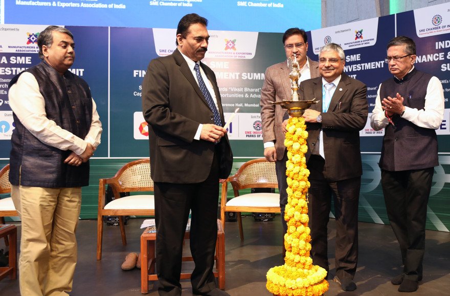 Shri Atul Kumar Goel – Chief Executive, Indian Banks’ Association (IBA) inaugurating the INDIA SME FINANCE & INVESTMENT SUMMIT organised by SME Chamber of India and Manufacturers & Exporters Association of India on 11th February 2026 at Mumbai. Others (L to R) Dr. Soumya Kanti Ghosh – Group Chief Economic Adviser, State Bank of India, Shri. Chandrakant Salunkhe – Founder and President, SME Chamber of India & Manufacturers & Exporters Association of India, Shri. Mahmood Khan – Vice President – Banking & Government Agencies, SME Chamber of India and Shri Ashishkumar Chauhan – MD & CEO, National Stock Exchange of India Ltd. (NSE).